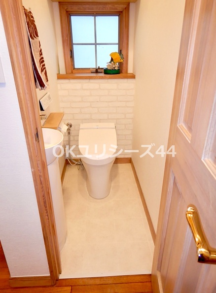内装は白系のレンガ調アクセントクロスを同じく窓下に貼り、優しい風合いの石目調のCFシートでまた1階とは雰囲気の違う明るいトイレになりました。