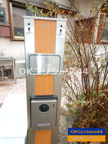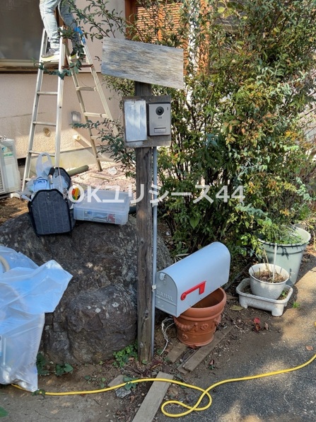 木製の支柱にドアホンと市販のポストを設置されていました。