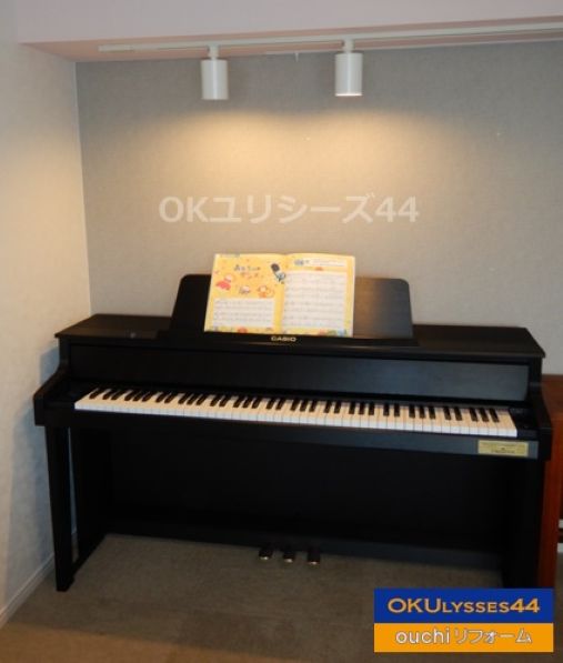 ピアノ専用の照明を新しく取り付けるにあたり、スポットライトの選定及び壁、梁部分のクロスが貼替となるためお客様にお好みのクロスをお選びいただきました。