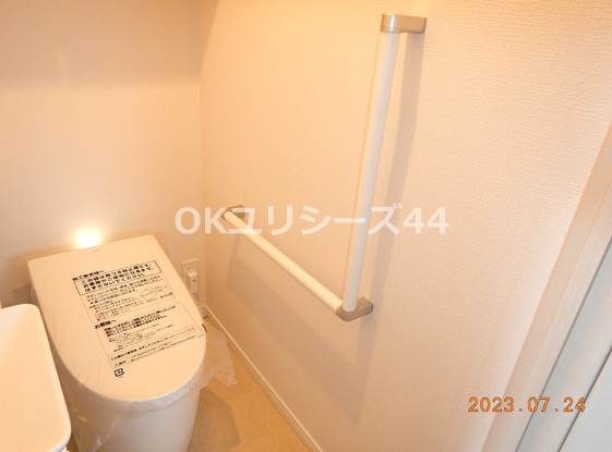 玄関の上がり框に縦型手すりを取り付けたいとご要望がありました。また、トイレはTOTOのショールームでご覧いただいたタンクレストイレに交換しましたが、壁面にL型の木製手すりを取り付けることになりました。